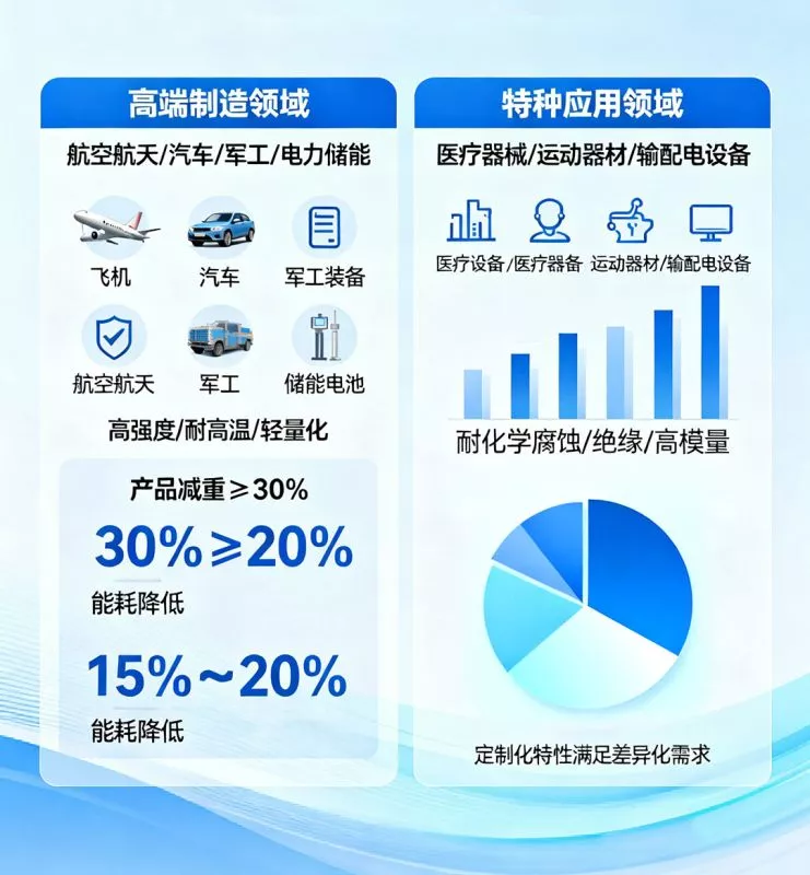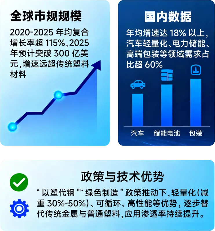 LFT 行业增长迅猛,2025 年全球市场将破300 亿美元(CAGR 超8%)。双碳驱动下轻量化需求激增,中国以超 60% 全球产能,成该领域创新与应用核心。广泛盖高端制造(航空航天、汽车等)及特种应用(医疗器械等)领域。其兼具高强度、轻量化、高刚性等优势,可实现产品减重降耗、提升包装稳定性,满足差异化定制需求。